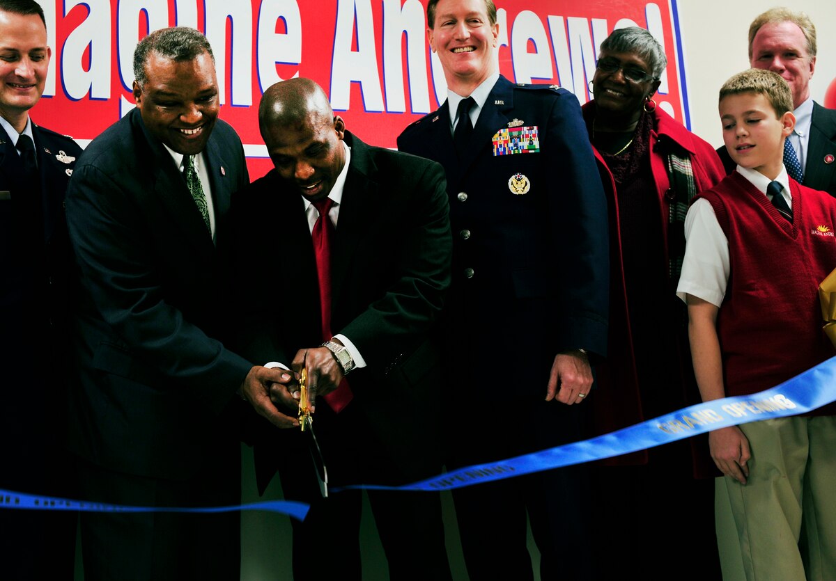 Honorable Rushern Baker (left), Prince George's County Executive, and Dr. Marquis Dwarte, Principal, join hands to perform the ribbon-cutting at the newly opened public charter school, Jan. 14, 2013 on Joint Base Andrews, Md. The new building provides larger classrooms, a multi-purpose room, as well as a media and music room. (U.S. Air Force photo/ Airman 1st Class Erin O’Shea)