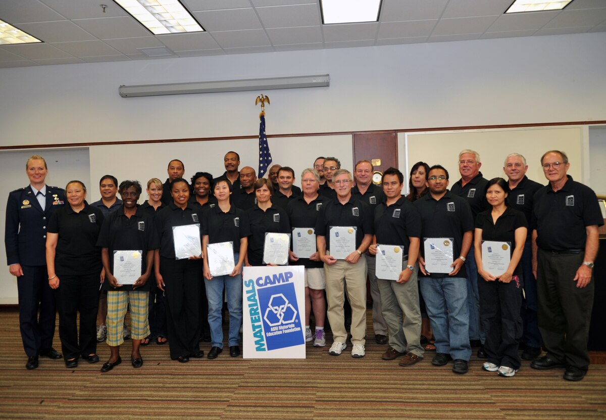 Janet Fenstermacher, teacher from Yorktown High School, Arlington, Va., holds a crystal during an Air Force-sponsored ASM International Materials Camp at Howard University in Washington, D.C., July 13. At the beginning of the week-long course, Fenstermacher poured a saturated form of copper sulfate into a glass dish and, once seed crystals formed, she tied a thread to the seeds allowing crystals to grow. Fenstermacher is one of 23 teachers who learned how to make science, technology, engineering and math fun for her students. (U.S Air Force photo by 1st Lt. Ashleigh Peck)