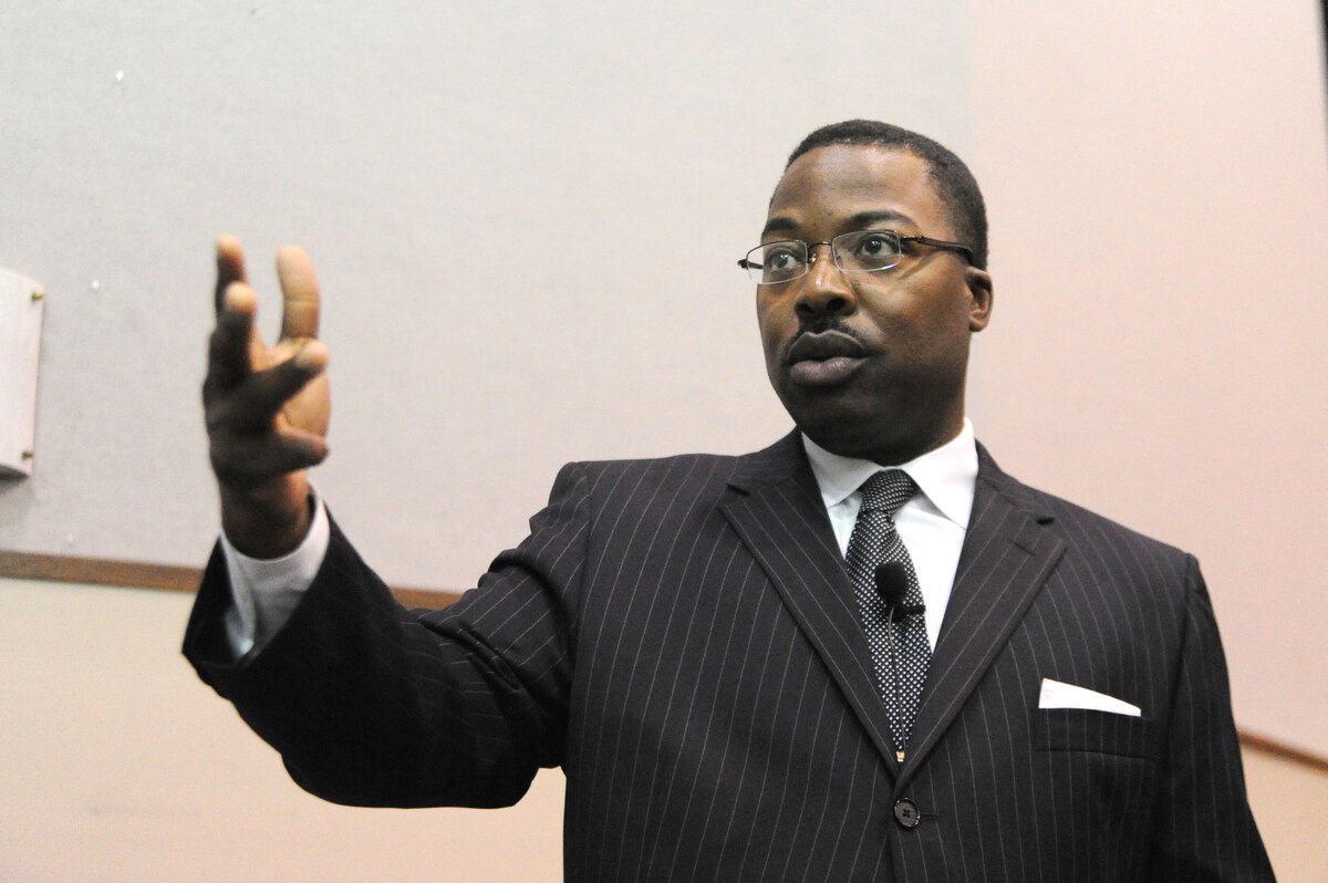 Air Force District of Washington Commander Maj. Gen. Darren McDew addressed his command Nov. 2, 2011 on Joint Base Andrews, Md., at the first of four town hall meetings to discuss Air Force-wide restructuring. The general also reminded the audience that while announcing the 4,500 job reductions, the Air Force also announced the addition of 5,900 positions in higher-priority areas like weapons buying, nuclear weapons management and the expanding field of intelligence, surveillance and reconnaissance.