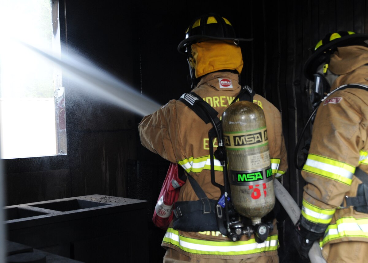 Matt Brady, 11th Civil Engineer Squadron firefighter, uses a fire hose to create hydraulic ventilation, removing hot air and gases from the building where the fire was extinguished Sept. 12 at the Fire Emergency Services Training Area on Joint Base Andrews. Brady administered first aid to an infant Oct. 12 during an emergency call and inevitably saved the baby's life. (U.S. Air Force photo/Airman 1st Class Bahja J. Jones)