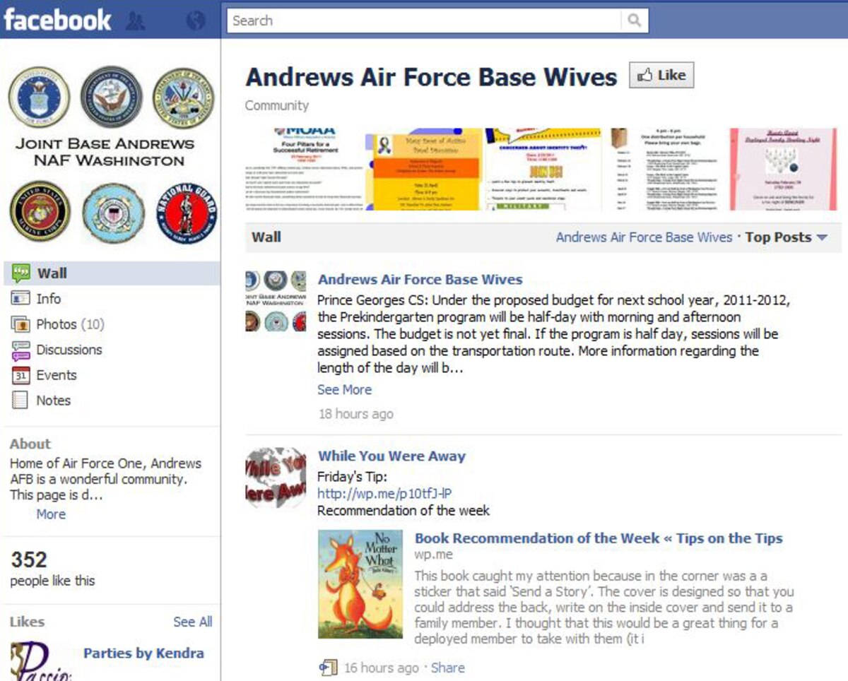 The Joint Base Andrews Wives Facebook page, created by Heather Umstattd, serves as an online forum for the wives of Andrews servicemembers to share information and creatively solve problems. The page is public, and accessible even to those not on Facebook.