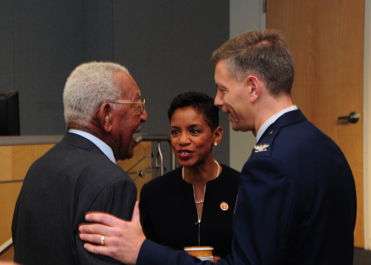 Daniel Brewington, left, a World War II veteran, speaks with Congresswoman Donna F. Edwards, center, and Col. Daniel Waters at the Veterans History Project Reception at Joint Base Andrews, Md., Nov. 8, 2013. The United States Congress created the Veterans History Project in 2000 to collect, preserve and make accessible the personal accounts of American, war veterans. Waters is the vice commander of 11th Wing/Joint Base Andrews and Edwards represents Maryland’s 4th Congressional District. (U.S. Air Force photo/Airman 1st Class Aaron Stout)